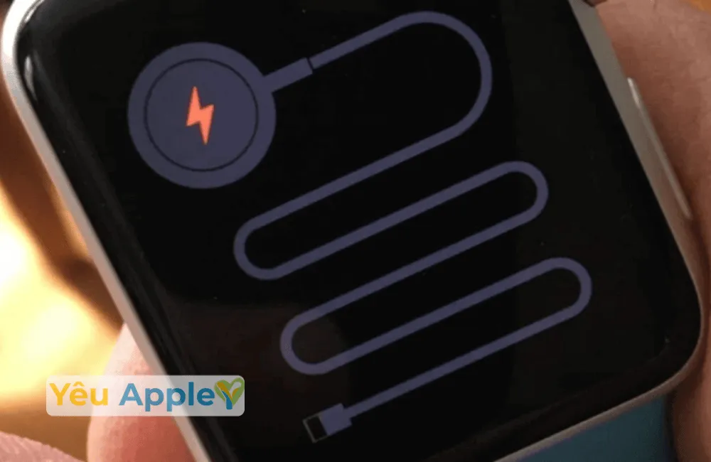 - Đồng hồ bị treo ở biểu tượng dây sạc đỏ: Dù đã cắm sạc rất lâu nhưng máy vẫn chỉ hiện biểu tượng yêu cầu sạc mà không khởi động lên được, dấu hiệu cho thấy cần thay main sạc Apple Watch.